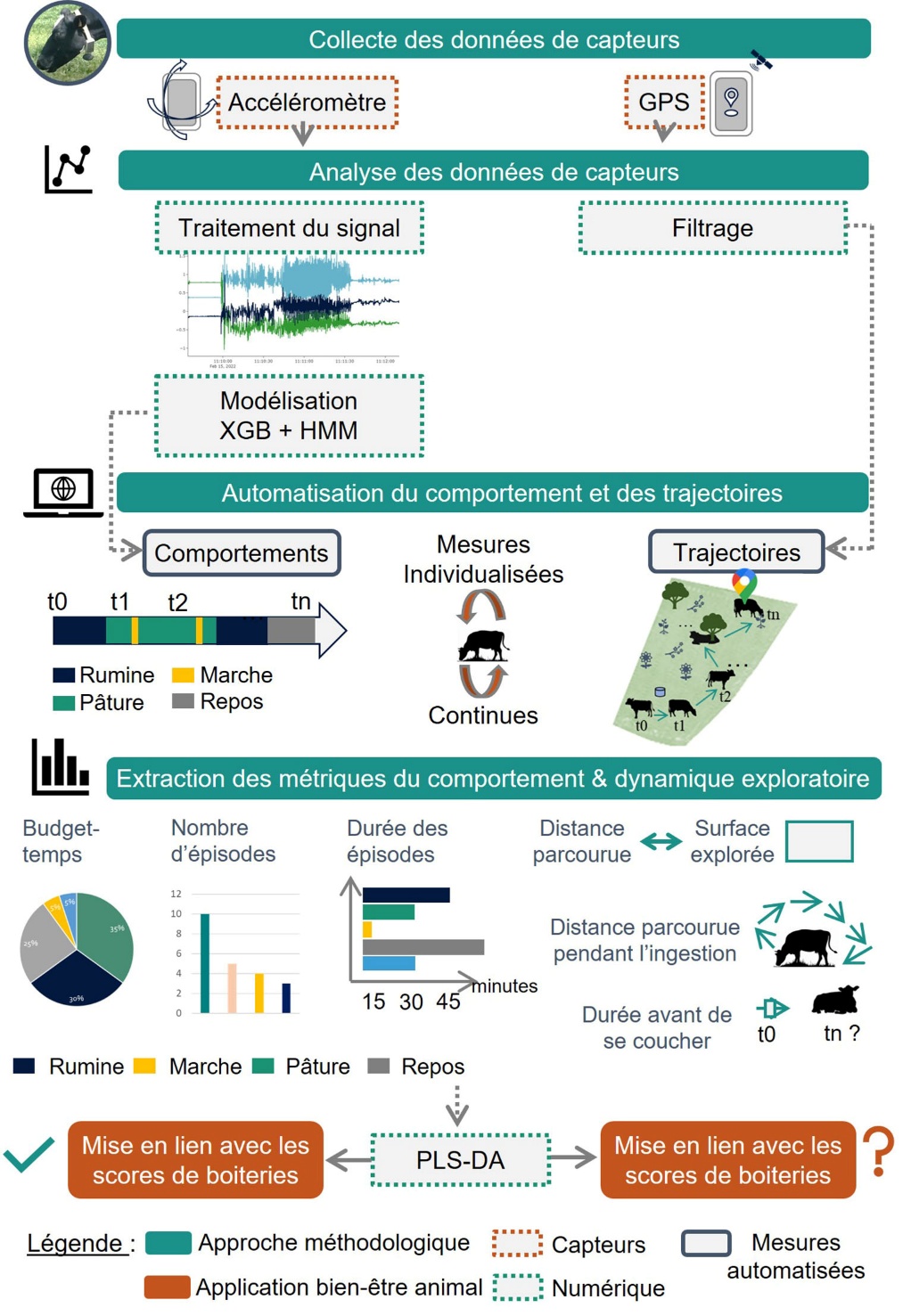 Capteurs et numérique : Des accéléromètres embarqués sur des colliers et un modèle de classification supervisée ont été utilisés pour obtenir les six comportements principaux des vaches laitières au pâturage au cours du temps (Riaboff et al., 2021). Un récepteur GPS a également été ajouté au collier afin de déterminer la géolocalisation (longitude et latitude) de l’animal dans la prairie toutes les secondes. Les trajectoires individuelles ont été calculées à partir des données de géolocalisation successives. Les six comportements principaux exprimés par chaque animal ont été suivis pendant quatre semaines chez 68 vaches laitières dans des élevages commerciaux. Des mesures individuelles indicatrices du comportement (budgets temps, nombre d’épisodes de pâturage/jour, durée des épisodes de pâturage/jour…) ou de la dynamique exploratoire (distance parcourue, surface explorée…) ont été extraites à partir du suivi du comportement et des trajectoires GPS. Une analyse discriminante (Analyse discriminante par moindres carrés partiels ou PLS-DA) a finalement été réalisée afin d’étudier les liens entre les mesures et les scores de boiteries des vaches laitières, évalués individuellement deux fois par semaine (gold standard).
