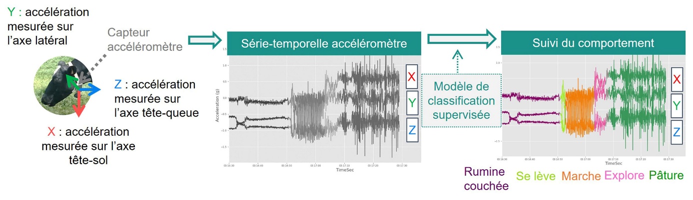 La classification des comportements des animaux à partir de données accéléromètriques constitue une illustration d’utilisation de modèles d’apprentissage automatique supervisés. Ainsi, le signal accéléromètrique obtenu en sortie de capteur est une série temporelle tridimensionnelle qu’il convient de traduire en comportements exprimés par chaque animal au cours du temps (figure 1). Dans notre exemple, les signaux envoyés sont traités par un algorithme d’apprentissage supervisé pour détecter cinq comportements : rumine, se lève, marche, explore et pâture.
