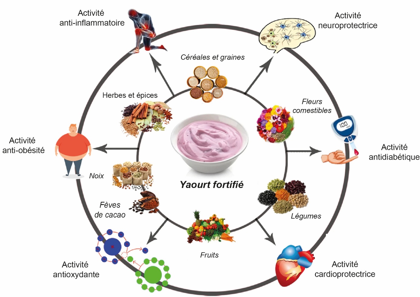 Le yaourt enrichi au fruit du moine et à la poudre de patate douce violette a démontré une activité anti-obésité et antidiabète et une protection contre les maladies cardiovasculaires, tout en réduisant de manière significative les taux sanguins de cholestérol total, de LDL et de triglycérides, ainsi qu’en modulant le taux de glycémie et en maintenant une valeur significativement plus basse de résistance à l’insuline (Lin et al., 2012 ; Ban et al., 2020 ; Khairani et al., 2020 ; Saini et al., 2021). En outre, selon Wijesekara et al. (2022), l’incorporation d’un extrait aqueux de curcumine dans un yaourt brassé a entraîné une diminution du nombre de cellules probiotiques viables. Cet effet peut être attribué aux propriétés antimicrobiennes inhérentes au curcuma. Par ailleurs, le yaourt brassé enrichi de 15 % de sirop de caroube a montré une activité antimicrobienne importante contre Bacillus cereus, Escherichia coli, Staphylococcus aureus, Enterococcus faecalis, Shigella spp. et Salmonella typhi (Shalabi, 2022). Le yaourt supplémenté avec 0,5 % d’extrait de pépins de raisin a montré une activité cytotoxique élevée contre les lignées cellulaires cancéreuses MCF-7 et HCT-116, entraînant respectivement une mort cellulaire de 62,47 % et 70,36 %. La présence de composés phénoliques dans l’extrait de pépins de raisin a joué un rôle important dans cette activité anticancéreuse (Tami et al., 2022).