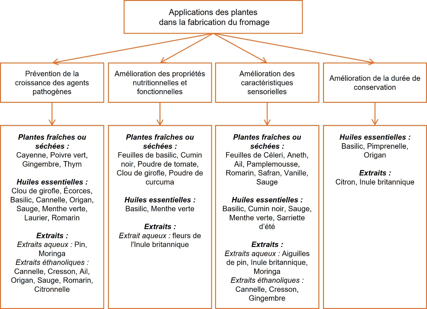 La figure 1 illustre diverses formes d’applications de composés d’origine végétale dans la production de fromage. Selon Wahba et al. (2010), les extraits de piment de Cayenne et de poivre vert ont permis de réduire la population de Staphylococcus aureus dans le fromage égyptien Kareish. Les extraits de cannelle, d’ail, de citronnelle, de cresson, de romarin, de sauge et d’origan ont montré leur potentiel à inhiber la croissance de Listeria monocytogenes dans le fromage fondu (Tayel et al., 2015). Certaines substances d’origine végétale ont montré leur efficacité dans l’inhibition du développement des champignons pathogènes (Gouvea et al., 2017). En outre, les herbes et les épices se présentent comme des aliments fonctionnels potentiels, en raison de la richesse en composés bioactifs qui confèrent des effets bénéfiques à la santé (Tapsell et al., 2006). Solhi et al. (2020) ont rapporté une amélioration des propriétés sensorielles et du comportement rhéologique du fromage fondu en ajoutant de la poudre de tomate ce qui a augmenté la teneur en lycopène et l’activité antioxydante des fromages traités, même après deux mois de stockage. En outre, l’ajout d’extraits aqueux d’Inula britannica L. à un fromage de type Cheddar a amélioré son activité antioxydante in vivo (Lee et al., 2016).