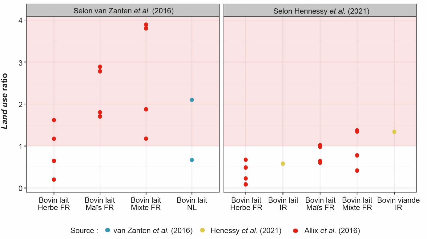 Surface utilisée (m²) par unité de produit (kg MS, Joule ou kg de protéine).
