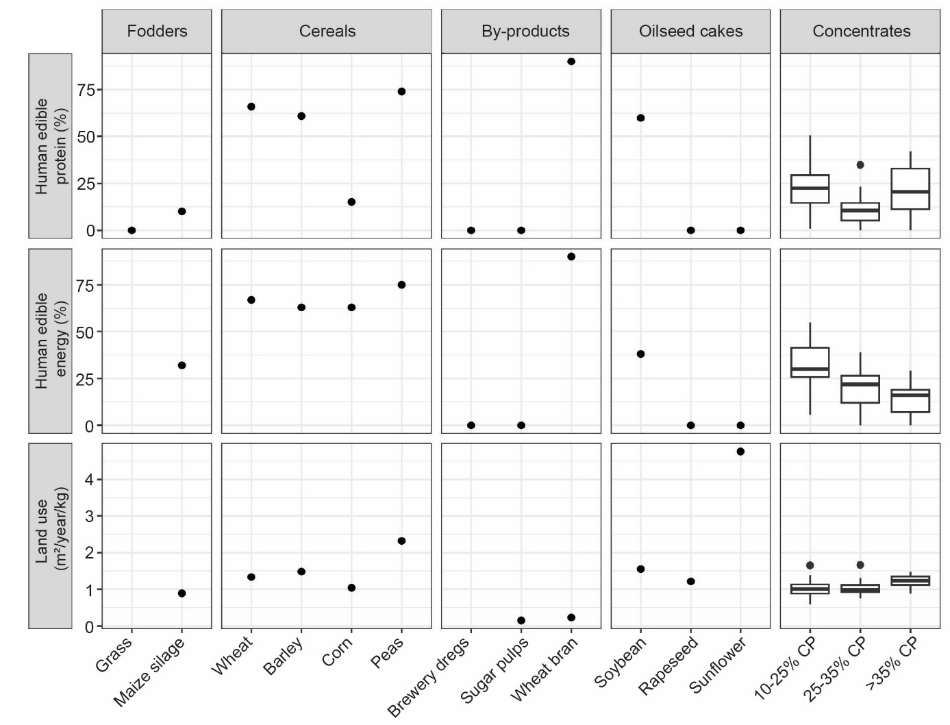 However, when livestock consume agricultural products that are edible for humans, they represent an additional trophic level in the agro-ecosystem between plants and humans, leading to unavoidable losses. On a global scale, 86% of the feed consumed by farm animals is fodder and industrial by-products inedible by humans (Mottet et al., 2017) although it is currently suggested that more food could potentially be produced in certain agricultural areas presently used for livestock production if they were converted to alternative cropping systems giving priority to humans-edible crops (van Zanten et al., 2016). As a result, animals are often directly viewed as one of the main causes of inefficiency in food systems (Garnett et al., 2015; Poore & Nemecek, 2018).