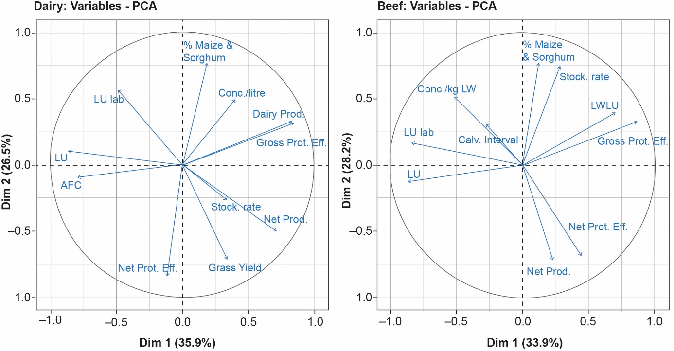 In order to gain better understanding of the variability of the performances observed, a summary of the correlations between management parameters and efficiency, land use and productivity indicators (calculated separately for the different databases used) is set out in Table 3. Graphs of the variables resulting from the principal component analysis are presented in Figure 6. Gross efficiencies (protein and energy) are strongly correlated with productivity per cow for dairy farms and weight gain per LU for meat farms, and therefore, in both cases, with the proportion of maize in the ration. Gross efficiency is also negatively correlated with age at first calving and calving-to-calving interval. In fact, the lower the age at first calving and the shorter the calving-to-calving interval, the lower the unproductive, and therefore inefficient periods for the animals. Net efficiencies (protein and energy) are negatively correlated with the use of concentrates (per litre or per kg of live weight) and the proportion of maize in the ration but positively correlated with the proportion of pasture for dairy farms. These findings support the observations made by Laisse et al. (2018) regarding a less productive grass-fed dairy cattle system but with higher net efficiency than the maize-based dairy system.