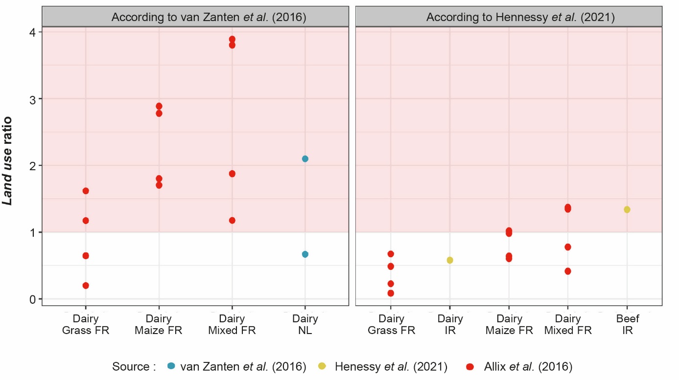 Figure 4. Results of the Land Use Ratio (LUR) as defined by van Zanten et al. (2016) on the left for French (FR) and Dutch (NL) systems and by Henessy et al. (2021) on the right for various dairy systems and an Irish beef system (IR).