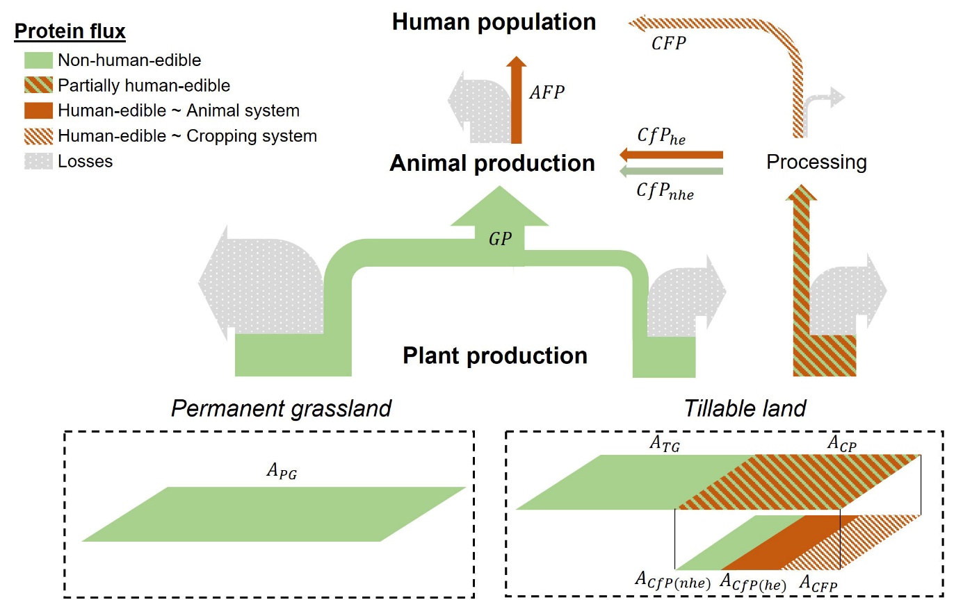 Abbreviations: P: Protein, A: Area, AFP: Animal-food protein, CFP: Crop-food protein, CfPhe: Human-edible crop feed protein, CfPnhe: Non-human-edible crop feed protein, GP: Grass-based protein, CP: Crop protein, PG: Permanent grassland, TG: Temporary grassland, CP: Crop protein area (Battheu-Noirfalise et al., 2023).