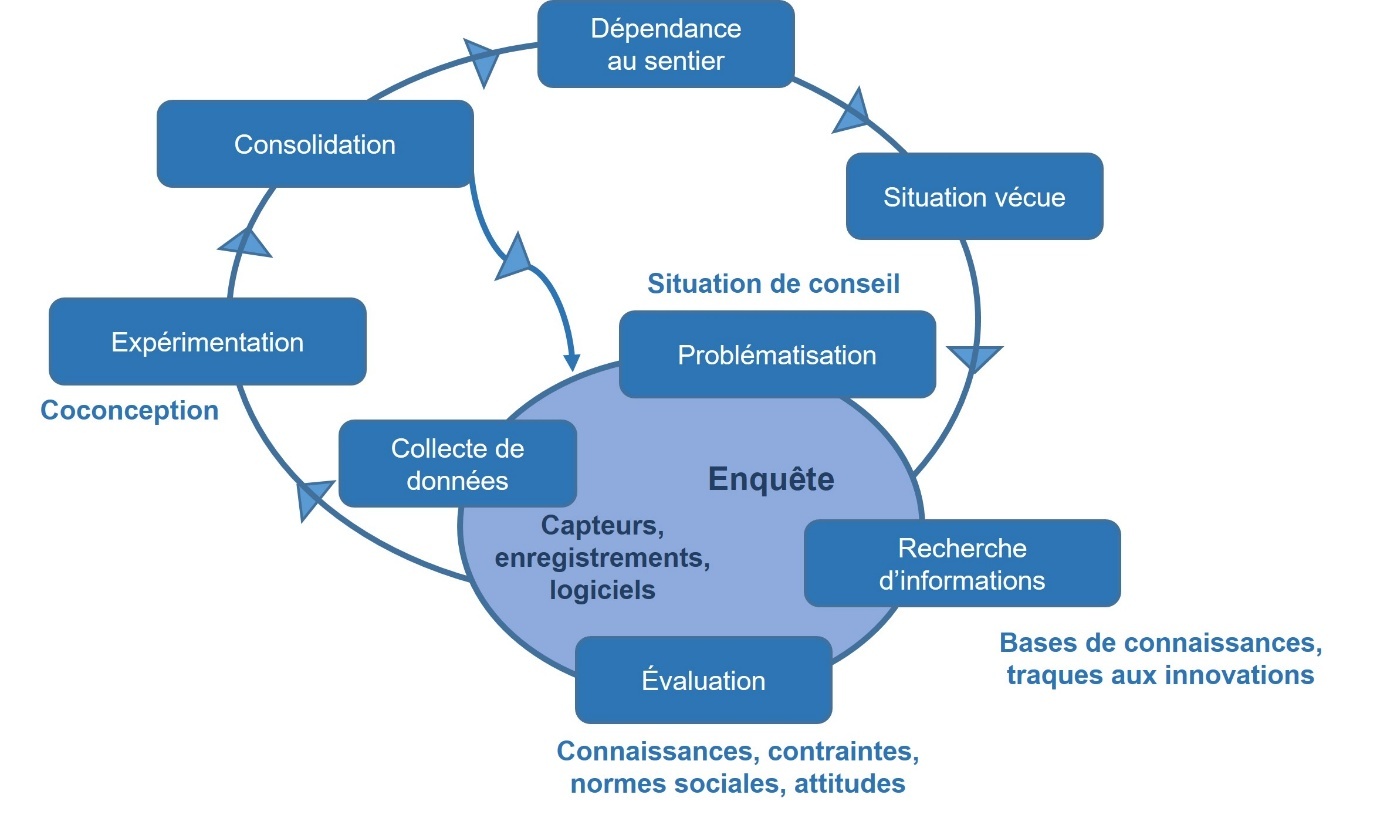 Les acteurs de la recherche et du conseil se dotent donc d’outils pour i) partager les connaissances théoriques et pratiques, ii) appréhender et réduire la complexité issue du nombre de facteurs à prendre en compte, de leurs interactions et de l’articulation de formes de connaissances diverses et hétérogènes, et iii) contribuer à la mise en action.