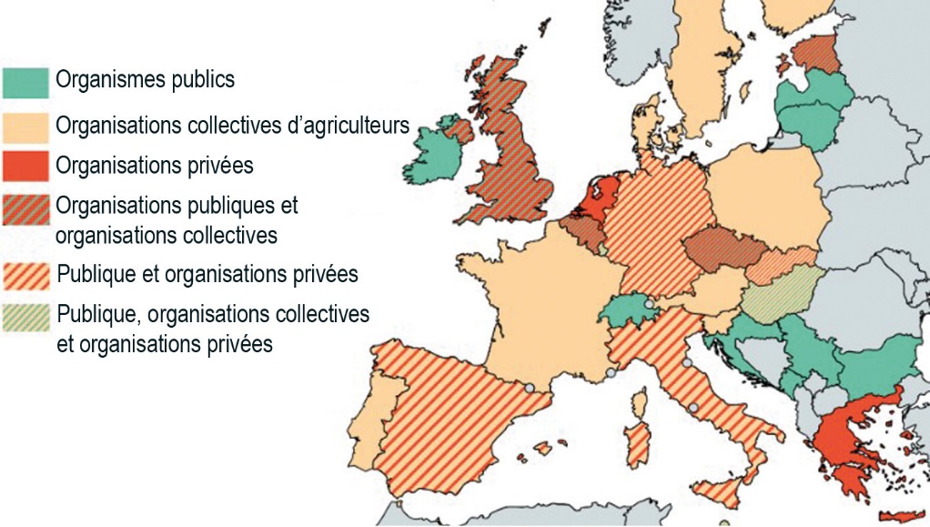 Sur le terrain, les acteurs du conseil en élevage sont très divers. Selon les pays, les pouvoirs publics et les acteurs publics de la recherche et de l’éducation ainsi que les organisations paysannes sont présents, mais c’est moins le cas dans certains pays où les entreprises privées sont davantage à la manœuvre (Grèce, Pays-Bas, République tchèque...) (figure 3).