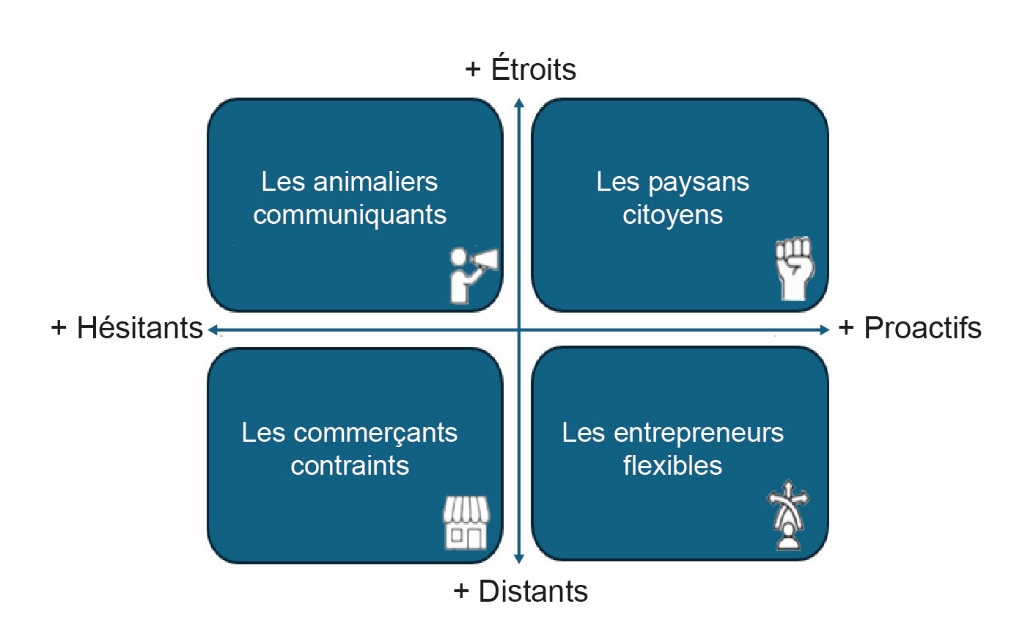 Fuselier et Delanoue (2024) illustrent ainsi quatre grands positionnements face au changement. Leur typologie croise représentation du métier et attitude par rapport aux attentes sociétales (figure 6). Les profils identifiés distinguent le rapport homme-animal (étroit/distant) et leur perception du changement (réfractaires/proactifs). Les enjeux sociétaux ne sont pas partagés par certains éleveurs, ou à l’inverse sont largement intégrés et pris en compte par d’autres. Le rapport étroit homme-animal est au cœur du métier des éleveurs et contribue à leur satisfaction. L’intérêt technique et le sens de produire pour son voisin sont aussi des motivations essentielles. Les éleveurs souhaitent également s’assurer un revenu moins faible et fluctuant, un vrai temps libre en dehors de l’astreinte de l’élevage, et attendent davantage de reconnaissance par la société.