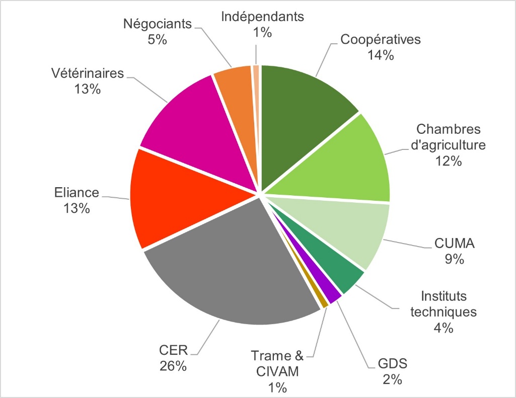 Les coopératives et fournisseurs d’approvisionnement sont le deuxième grand groupe d’acteurs de caractère coopératif ou privé qui fournit du conseil auprès des éleveurs. Souvent impliqués dans la commercialisation des produits (lait, viande…), ils sont le premier accès des agriculteurs aux informations techniques. Leur rôle de conseil est parfois ambigu, entre la vente, l'information sur les intrants agricoles et les marchés et le conseil technique proprement dit. Depuis 2021, la réglementation clarifie cette équivoque et sépare les agréments, les capitaux et les instances de gouvernance pour le conseil et la vente de produits phytopharmaceutiques. Mais les coopératives conservent une mission de contrôle des cahiers des charges de production. Par ailleurs, en 2023, Eliance, la fédération des organismes de conseil en élevage et d’insémination revendiquait le suivi de la moitié des éleveurs de ruminants. Leur appui reste associé à l’amélioration génétique des troupeaux et au pilotage technico-économique des ateliers, mais ils interviennent plus largement sur le fonctionnement l’exploitation.