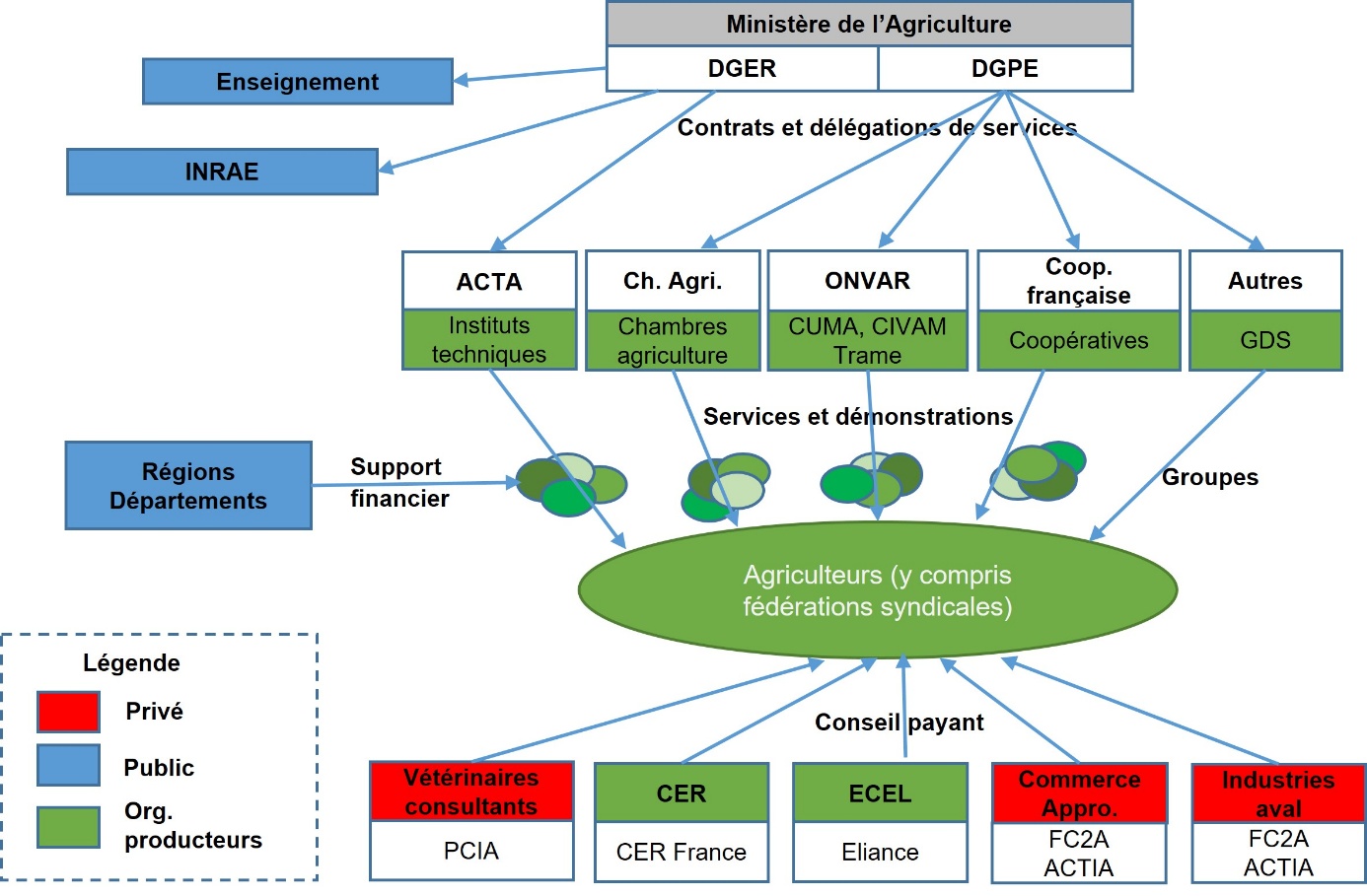 Les chambres d’agriculture sont présentes sur l’ensemble du territoire. Pendant longtemps elles ont participé activement aux missions régaliennes d’animation du dispositif génétique et d’identification, bénéficiant alors d’un contact étroit auprès des détenteurs d’animaux. Dans les années 1990-2000, une partie des agents a été orientée vers l’accompagnement des transitions agroécologiques, la mise en place de la réglementation environnementale, et l’appui aux installations ou orientations des exploitations. Les chambres d’agriculture ont ainsi investi une démarche d’approche stratégique. Les ONVAR (Organismes nationaux à vocation agricole et rurale) sont engagés dans la transformation des pratiques agricoles vers l’agroécologie, et la redynamisation des liens entre agriculteurs, et avec les territoires. Ils mobilisent une approche systémique de la complexité dans leur conseil stratégique.