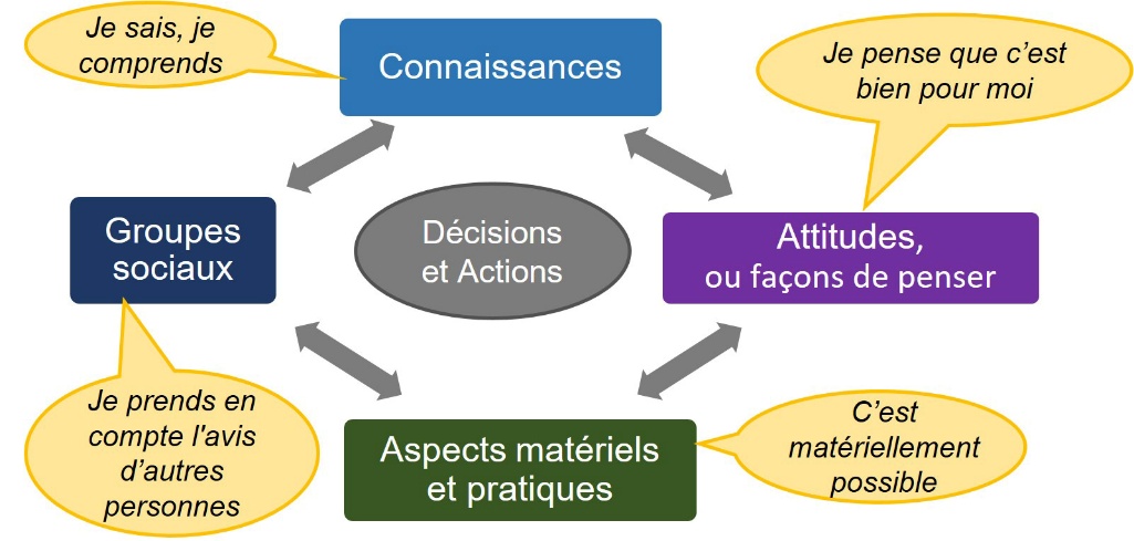 Cependant, le comportement des agriculteurs, au-delà de l’apport de connaissances, dépend de leur volonté, de leur capacité et de leur niveau d’engagement à adopter un changement de pratiques. Tous ces éléments sont déterminés par une multitude de facteurs tels que l'engagement avec les conseillers, les attitudes, le contrôle comportemental perçu, le capital social, les ressources financières, etc. Dockes et al. (2010) ont ainsi conceptualisé la prise de décision en élevage autour de quatre familles de facteurs (figure 1).