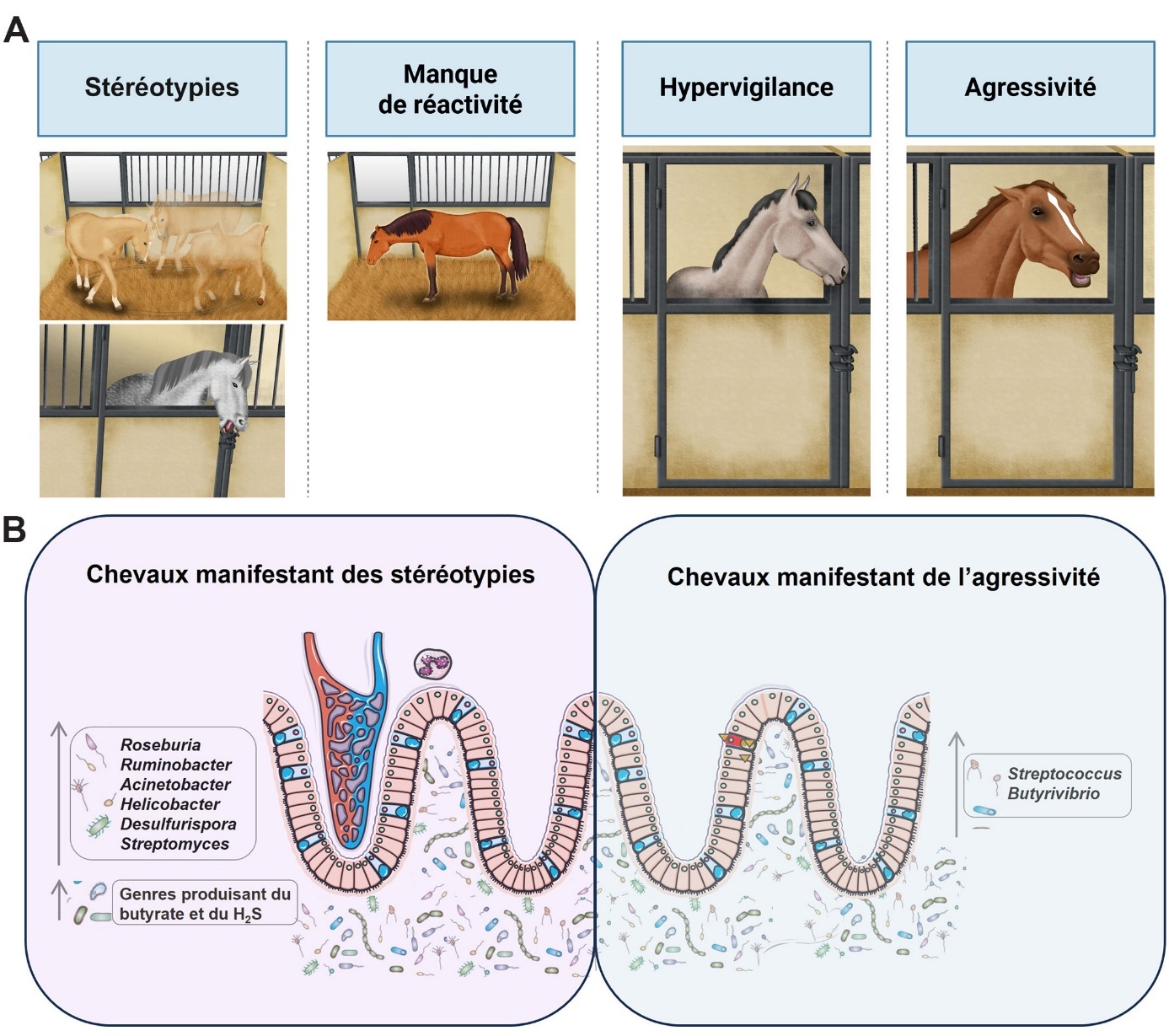 Chez les chevaux, le rôle du microbiote intestinal dans les changements comportementaux a été avancé par Destrez et al. (2015), qui ont observé que la concentration de bactéries amylolytiques et l’abondance des Succinivibrionaceae étaient positivement corrélées au comportement d’alerte, considéré comme une forme d’hypervigilance, après un régime pauvre en fibres mais riche en amidon. Chez les poneys nourris avec des régimes riches en amidon, une réactivité comportementale accrue a été liée à des changements dans le microbiote intestinal, suggérant que la composition du microbiote intestinal et le comportement sont liés et s’influencent mutuellement (Bulmer et al., 2019). Notre équipe, à son tour, a démontré que chez les chevaux d’élite, des indicateurs comportementaux de bien-être, tels que les stéréotypies, l’hypervigilance et l’agressivité, ont été associés à des profils de microbiote intestinal différents (Mach et al., 2020) (figure 3B). Plus spécifiquement, l’abondance des genres Desulfurispora, Helicobacter, Acinetobacter, Ruminobacter, Pseudobacteroides, Roseburia et des membres de la famille Marinilabiliaceae était plus élevée chez les chevaux présentant des stéréotypies orales. En revanche, le genre Streptomyces était plus abondant chez ceux présentant des stéréotypies de locomotion. Une fréquence plus élevée d’agressivité était associée à une prolifération des genres Streptococcus et Butyrivibrio spp., mais inversement corrélée à la prévalence d’Anaeroplasma. Des premières indications suggèrent une association entre le genre Streptococcus et les réponses au stress chez les mammifères, mais des recherches approfondies restent nécessaires pour mieux comprendre ce lien (Nguyen et al., 2015). Les indices de diversité ont indiqué que l’hypervigilance était associée à un microbiote plus hétérogène. Bien qu’il n’y ait pas de différences dans le nombre d’espèces microbiennes entre les animaux, l’hypervigilance a induit des différences notables dans l’abondance de certaines bactéries comme Denitrobacterium et Dehalobacterium (Mach et al., 2020). Jusqu’à présent, aucune étude n’établit une association entre ces deux genres bactériens et le stress. Des expériences supplémentaires sont nécessaires pour corroborer ces résultats.