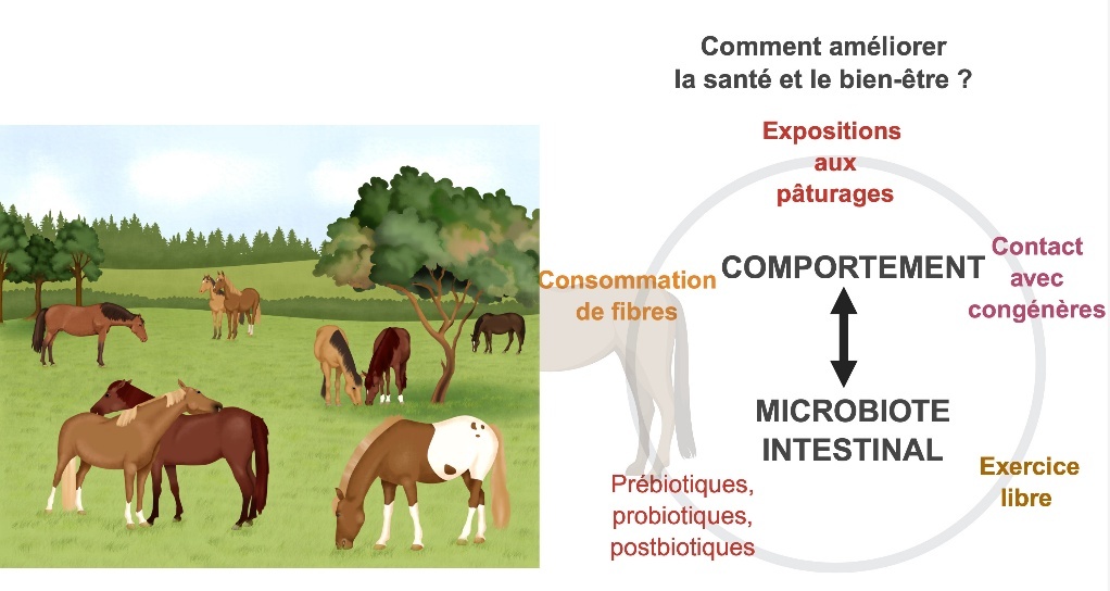 Nous avons démontré qu’au-delà de la détérioration du bien-être (Ruet et al., 2019), les chevaux logés en continu dans des boxes individuels et nourris avec des régimes hyperconcentrés subissent des altérations substantielles de leurs communautés microbiennes intestinales, suggérant le lien entre le bien-être et le microbiote intestinal (Mach et al., 2020). Le microbiote intestinal, composé de bactéries, d’archées, de virus, d’eucaryotes et de champignons, joue un rôle dans la santé animale à travers ses interactions complexes avec l’hôte. Ces interactions, probablement favorisées par la diversité génétique et fonctionnelle du microbiote, contribuent aux processus physiologiques et immunitaires essentiels (Mach et al., 2020). Le microbiote intestinal est très réactif aux changements environnementaux, aux conditions d’élevage, aux infections et aux facteurs propres à l’hôte (Fassarella et al., 2021). La composition du microbiote intestinal adulte peut notamment changer rapidement avec des changements alimentaires et des perturbations importantes telles que l’administration d’antibiotiques ou l’exposition à un stress chronique (Brugman et al., 2018).