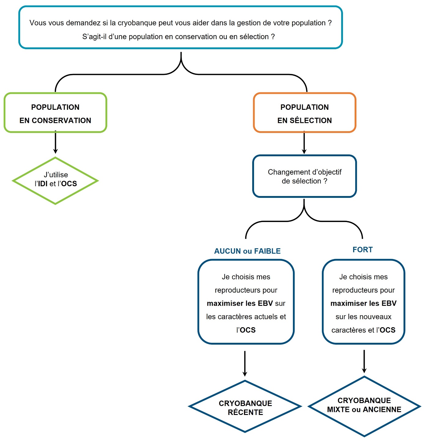 Les losanges correspondent aux recommandations d’utilisation des collections cryoconservées. IDI : Index of Diversity Impact, EBV : Estimated Breeding Values, OCS : Optimal Contribution Selection.