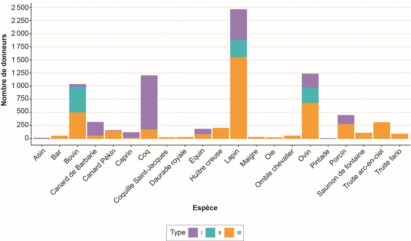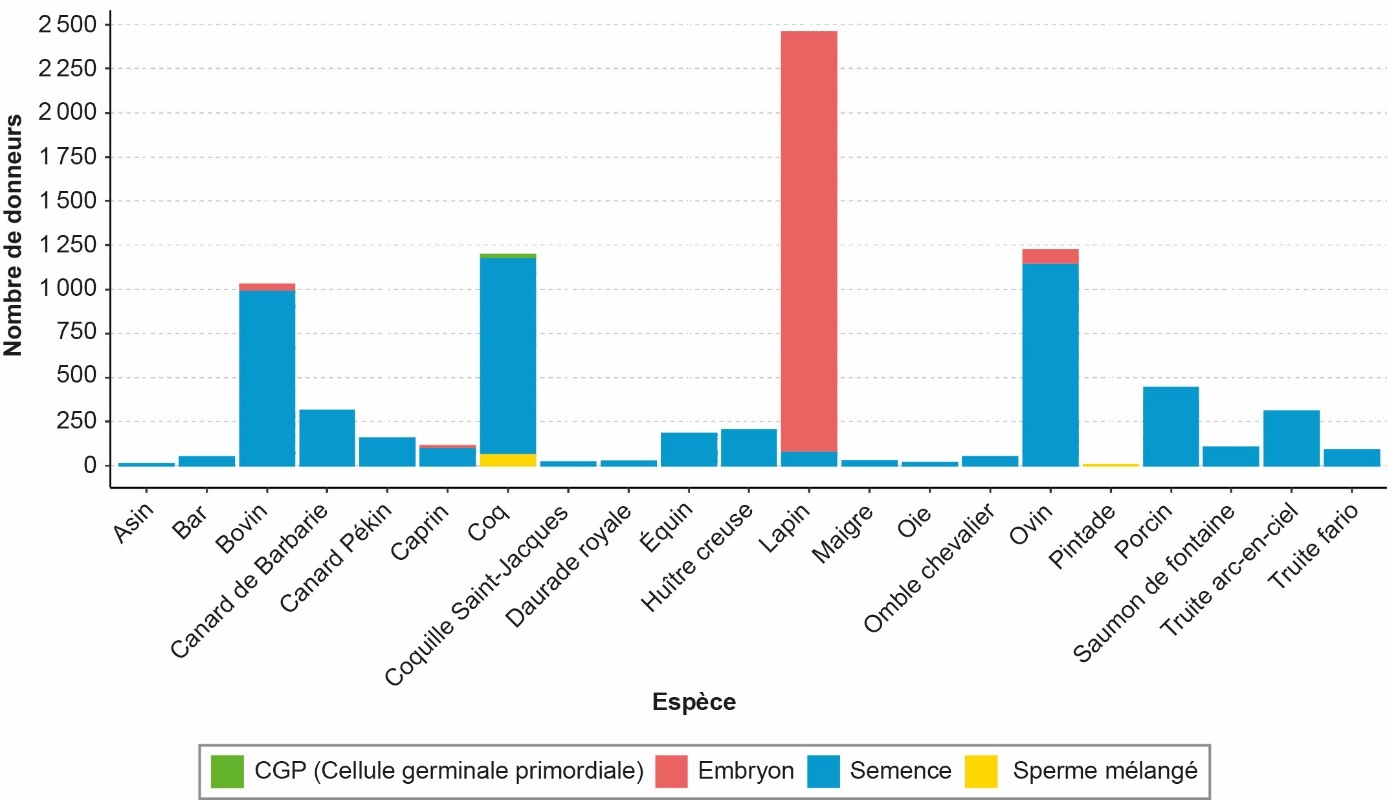 La Cryobanque nationale française, créée en 1999, a pour objectif de regrouper et conserver sur le long terme l’ensemble du matériel reproductif des collections ex situ pour les espèces d’élevage. Actuellement, 22 espèces disposent déjà de matériel cryoconservé. Ces espèces proviennent de différents taxons avec notamment des mammifères (ruminants, porcs, lapins, ânes et chevaux), des oiseaux (poules, pintades et canards) et des espèces aquacoles (poissons, coquilles Saint-Jacques et huîtres). L’ensemble de ces espèces, représentées par un total de 274 races ou lignées, regroupe un total de 8 816 donneurs qui disposent déjà de matériel cryoconservé avec un total de 456 530 doses d’insémination. Cependant, le contenu des collections de la Cryobanque nationale est très variable selon les espèces et il est nécessaire de documenter régulièrement ces collections ex situ (Jacques et al., 2024). En effet, la semence cryoconservée n’est pas le seul matériel disponible en collections, bien que ce soit le type de ressources très majoritaire. Par exemple, l’embryon est le type de ressource principalement utilisé pour les collections de lapins. Pour les coqs et les pintades, en plus des semences cryoconservées, les collections peuvent se composer de spermes mélangés (c.-à-d. issus de plusieurs coqs) ou de cellules germinales primordiales. Un bilan du type de matériel disponible par espèce est représenté en figure 4 et illustre sa variabilité.