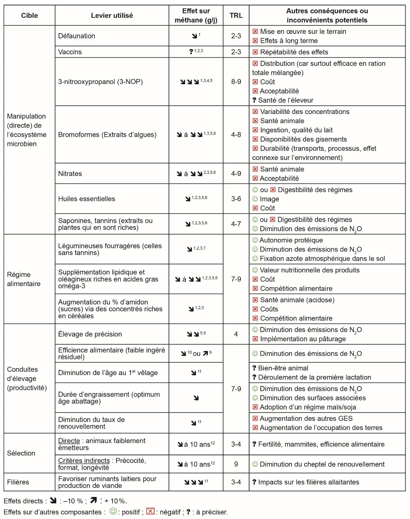 Les leviers alimentaires ont un effet modeste (–10 à –20 %) comparativement à certains additifs (–20 à –40 %) mais ont souvent moins de conséquences négatives (observées ou anticipées) sur d’autres composantes de l’animal ou du système (tableau 1). Ils ont un effet immédiat sur la variation des émissions de méthane entérique contrairement aux leviers génétiques où l’effet s’estime à 10 ans. Les variations de l’amplitude des réductions observées avec des leviers alimentaires résultent de la concentration des principes actifs dans les ressources végétales et à de possibles interactions avec d’autres composés de la ration, avec le stade physiologique de l’animal, et(ou) à d’autres facteurs confondants.