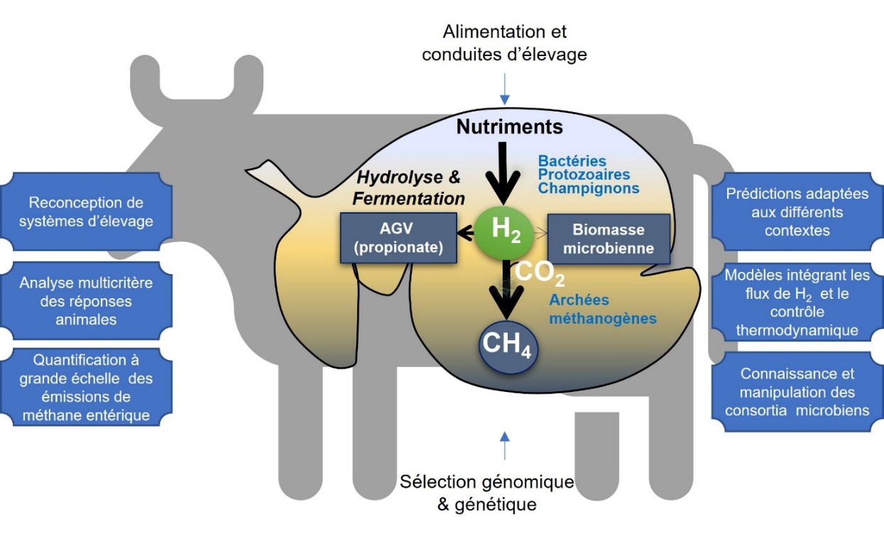Les recherches pour identifier les mécanismes biologiques à l’origine des émissions de méthane par l’animal doivent se poursuivre, en particulier celles visant à mieux comprendre les relations entre la diversité microbienne dans le rumen et les phénotypes de l’animal hôte. Ces recherches tireront parti des nouvelles méthodes d’analyses à haut débit pour définir les relations syntrophiques entre les microorganismes, et d’intégration de données dans des modèles de prédiction ou d’évaluation multicritère. Cela permettra d’identifier de nouvelles solutions, basées par exemple sur les flux d’hydrogène, la capture d’électrons ou la promotion de certains consortia de microorganismes, sans pénaliser la valorisation des glucides pariétaux des fourrages par l’animal, préservant ainsi sa production et sa santé.