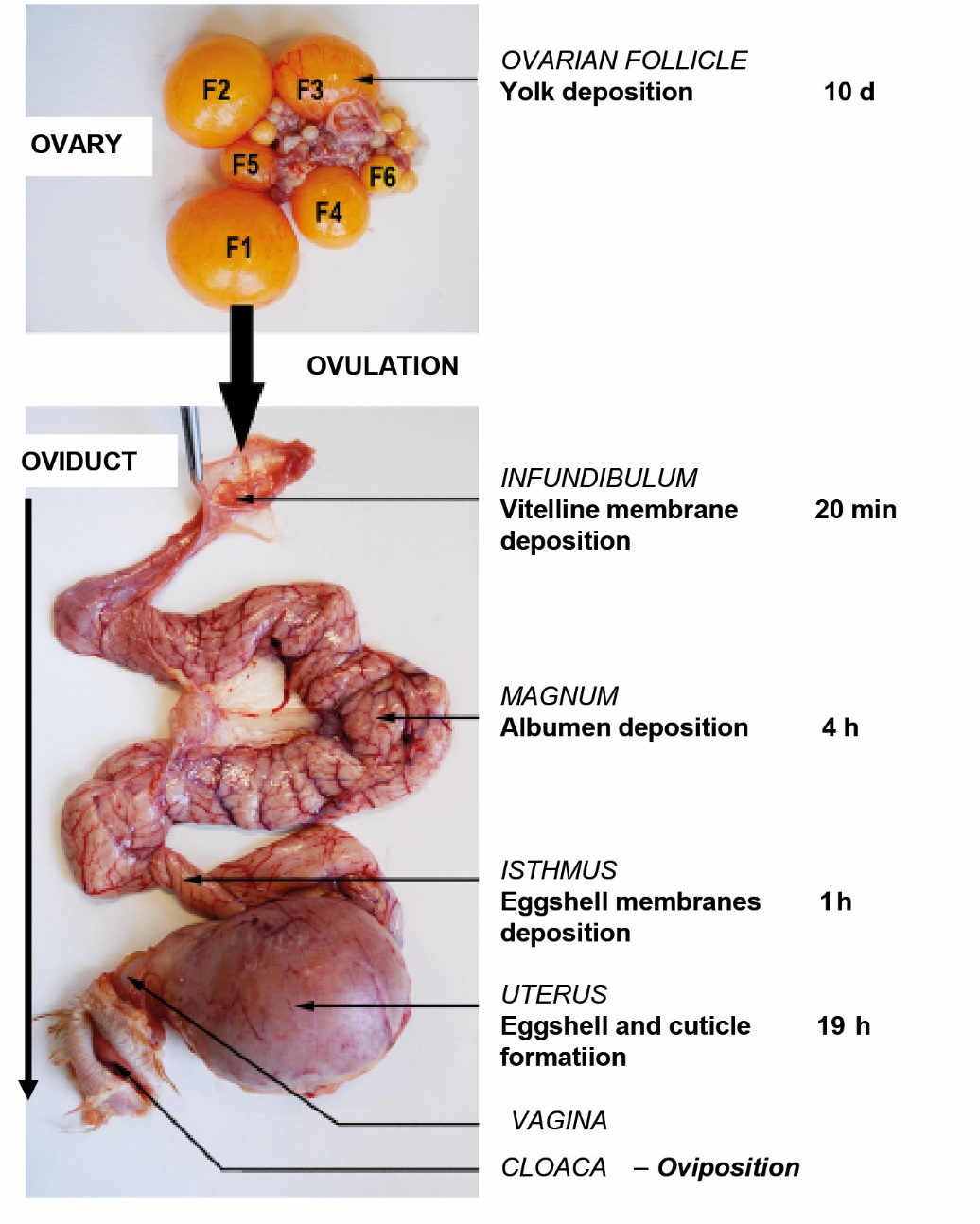 The egg is a complex structure that contains all the components necessary for the development and protection of an embryo. It is synthesised in the female reproductive system, which is divided into two parts: the ovary and the oviduct. The oocyte or ‘yolk’ is produced in the ovary. When mature, it is released towards the oviduct, which is ovulation. The other components of the egg (vitelline membrane, albumen or ‘white,’ eggshell membranes, eggshell, and cuticle) are deposited in the oviduct. The oviduct is composed of five compartments: the infundibulum, magnum, isthmus, uterus, and vagina. After ovulation, the oocyte is taken up by the oviduct in the infundibulum. It takes about five hours for the yolk membrane, albumen, and eggshell membranes to settle around the yolk. The synthesis of the eggshell takes place mainly in the uterus. This stage takes about 19 hours. The cuticle is secreted at the end of eggshell formation. Oviposition or egg laying takes place about 24–26 h after ovulation (Sauveur, 1988; see Box 3).