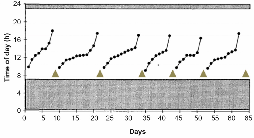 The light period is between 7 h and 23 h. The grey areas represent the dark period. Each dot represents one egg. Eggs from the same clutch are connected by a line. A pause day (day without laying) is symbolised by a triangle.