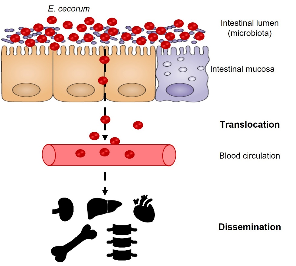Horizontal transmission can result from direct contact between animals or indirectly, via contaminated equipment. Birds excrete E. cecorum in their droppings, and can thus become infected via the faecal-oral route (Borst et al., 2017). In addition, the bacterium could be transmitted by inhalation of contaminated dust from farm houses (Jung & Rautenschlein, 2014). The frequency of recurrences on farms, as reported in Belgium (Herdt et al., 2008) and France (Potier et al, 2024) suggests that there may be biological reservoirs such as darkling beetles, rodents, etc., or environmental reservoirs in areas of persistence difficult to clean and disinfect, such as feeding lines, ventilation and heating systems, as well as drinking pipettes, feeders and cracks in the floor (Luyckx et al., 2015; Tessin et al., 2024). A recent study shows a higher prevalence in summer (Dunnam et al., 2023). The bacterium survives on different substrates (litter, dust, plastic) at different temperatures and humidity levels, particularly on litter at 15°C and 32% humidity (Grund et al., 2021). In this study, the two clinical strains showed prolonged survival compared with the commensal strain. Although E. cecorum has not been isolated from the environment of farms affected by the bacterium (Robbins et al., 2012; Grund et al., 2022), the presence of DNA from the 16S gene of E. cecorum was detected in the drinking systems (Grund et al., 2022) and also after cleaning in the air admission circuit and the anteroom (Tessin et al., 2024). Further research is therefore needed to provide a better understanding of the E. cecorum contamination routes and of persistence areas on the farms.