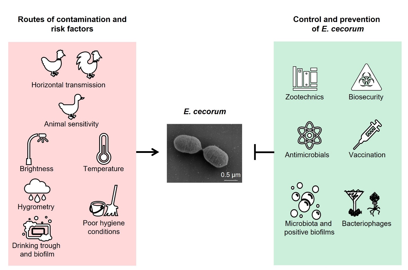 This review attempts to establish a link between current physiological and molecular knowledge of E. cecorum and pathology on farms. It also looks at possible modes of transmission, detection methods and current treatments, as well as preventive zootechnical and biosecurity measures to contain the spread of this bacterium within and between farms. Lastly, it discusses strategies of research and development for controlling this pathogen on farms (Figure 1).